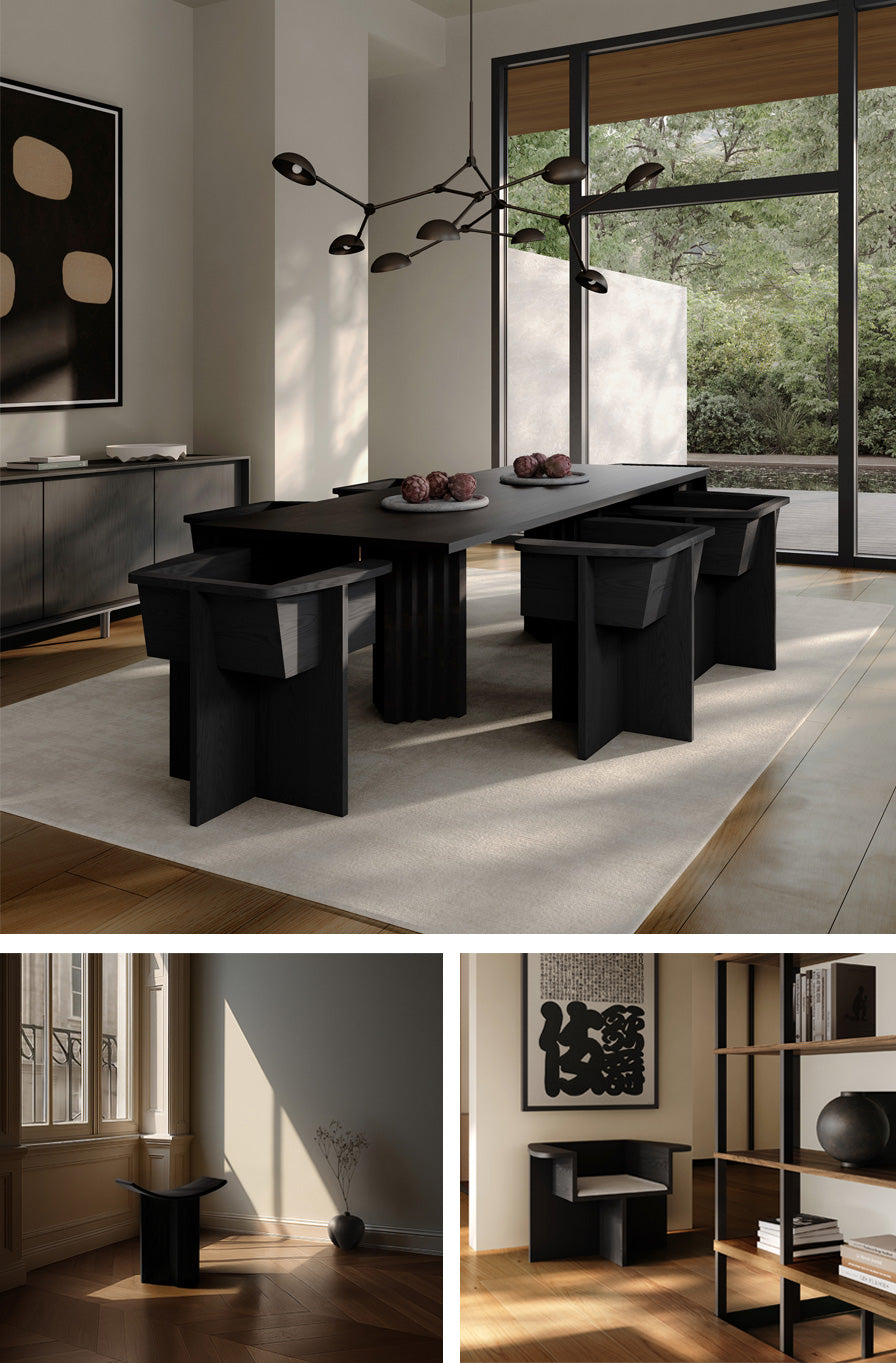 The solid oak construction enhances the sculptural quality of each design, where sharp, defined lines meet gentle curves of the backrests and armrests.