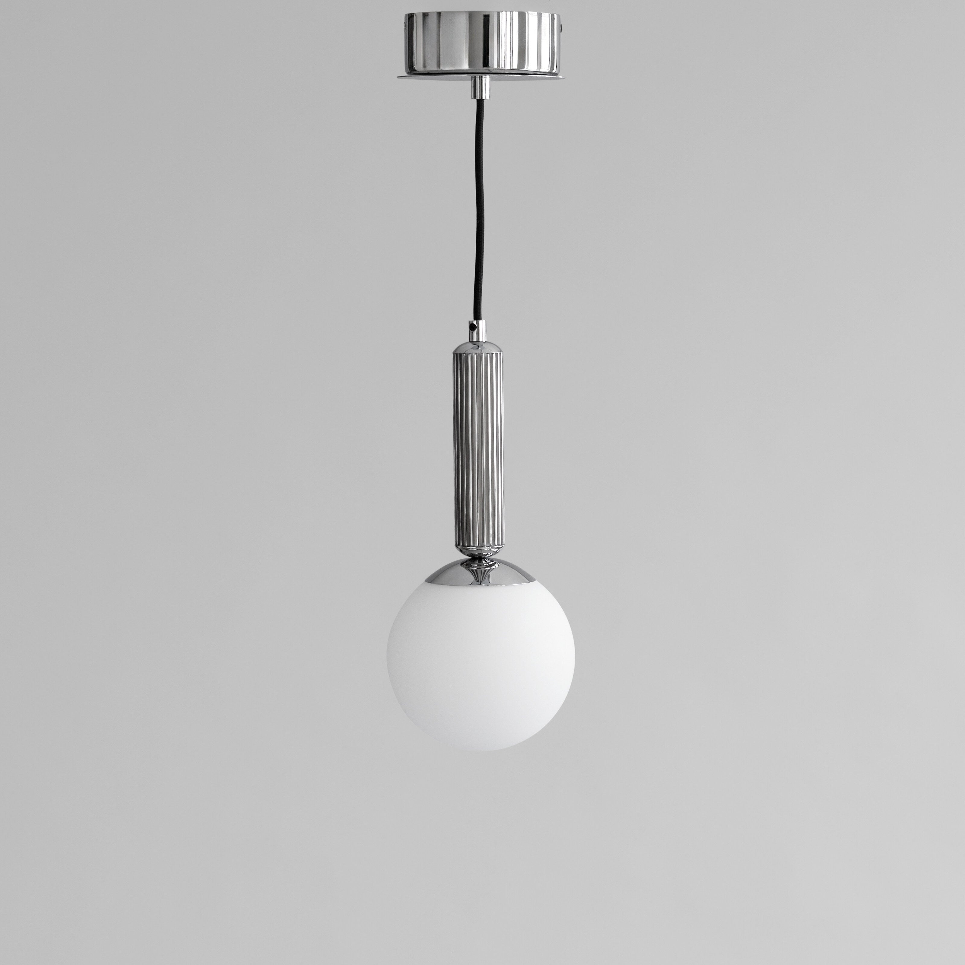 Paired with a circular opal glass lampshade, the chrome-finished body creates a soft, ambient glow while maintaining a precise, architectural expression. The polished chrome surface reflects its surroundings with mirror-like clarity, enhancing the pendant’s luminous presence without overpowering the space.