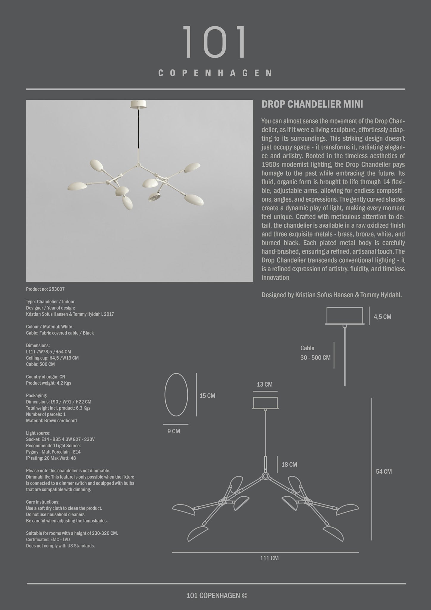 You can almost sense the movement of the Drop Chandelier, as if it were a living sculpture, effortlessly adapting to its surroundings. This striking design doesn’t just occupy space - it transforms it, radiating elegance and artistry. Rooted in the timeless aesthetics of 1950s modernist lighting, the Drop Chandelier pays homage to the past while embracing the future. Its fluid, organic form is brought to life through 14 flexible, adjustable arms, allowing for endless compositions, angles, and expressions. The gently curved shades create a dynamic play of light, making every moment feel unique. Crafted with meticulous attention to detail, the chandelier is available in a raw oxidized finish and three exquisite metals - brass, bronze, burned black and white. Each plated metal body is carefully hand-brushed, ensuring a refined, artisanal touch. The Drop Chandelier transcends conventional lighting - it is a refined expression of artistry, fluidity, and timeless innovation.
