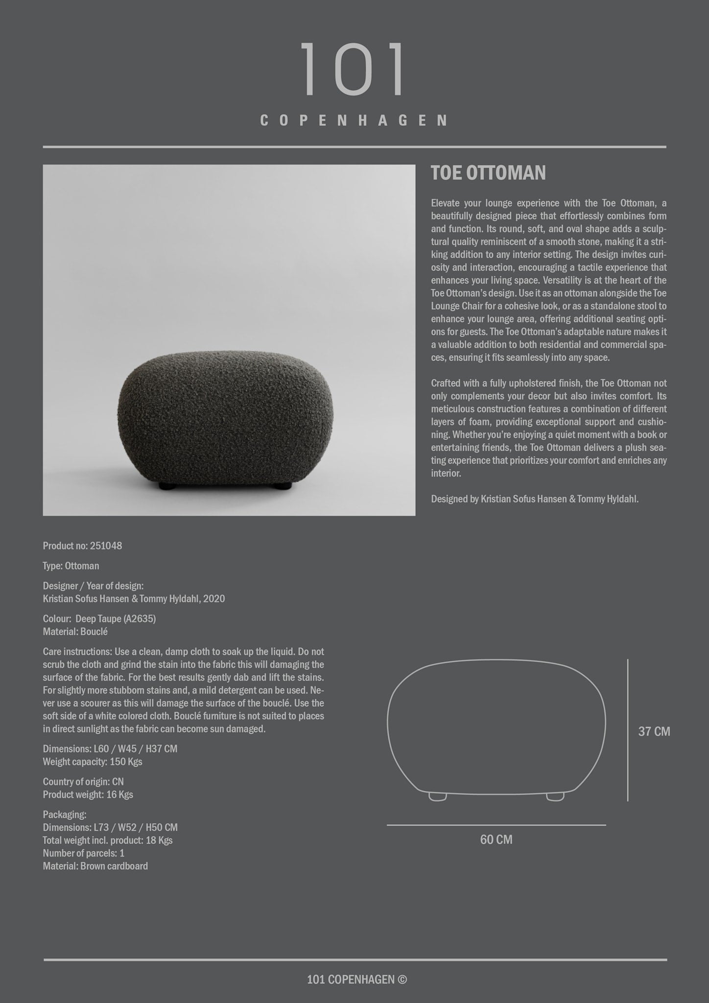 Elevate your lounge experience with the Toe Ottoman, a beautifully designed piece that effortlessly combines form and function. Its round, soft, and oval shape adds a sculptural quality reminiscent of a smooth stone, making it a striking addition to any interior setting. The design invites curiosity and interaction, encouraging a tactile experience that enhances your living space. Versatility is at the heart of the Toe Ottoman’s design. Use it as an ottoman alongside the Toe Lounge Chair for a cohesive look, or as a standalone stool to enhance your lounge area, offering additional seating options for guests. The Toe Ottoman’s adaptable nature makes it a valuable addition to both residential and commercial spaces, ensuring it fits seamlessly into any space. Crafted with a fully upholstered finish, the Toe Ottoman not only complements your decor but also invites comfort. Its meticulous construction features a combination of different layers of foam, providing exceptional support and cushioning. Whether you’re enjoying a quiet moment with a book or entertaining friends, the Toe Ottoman delivers a plush seating experience that prioritizes your comfort and enriches any interior.