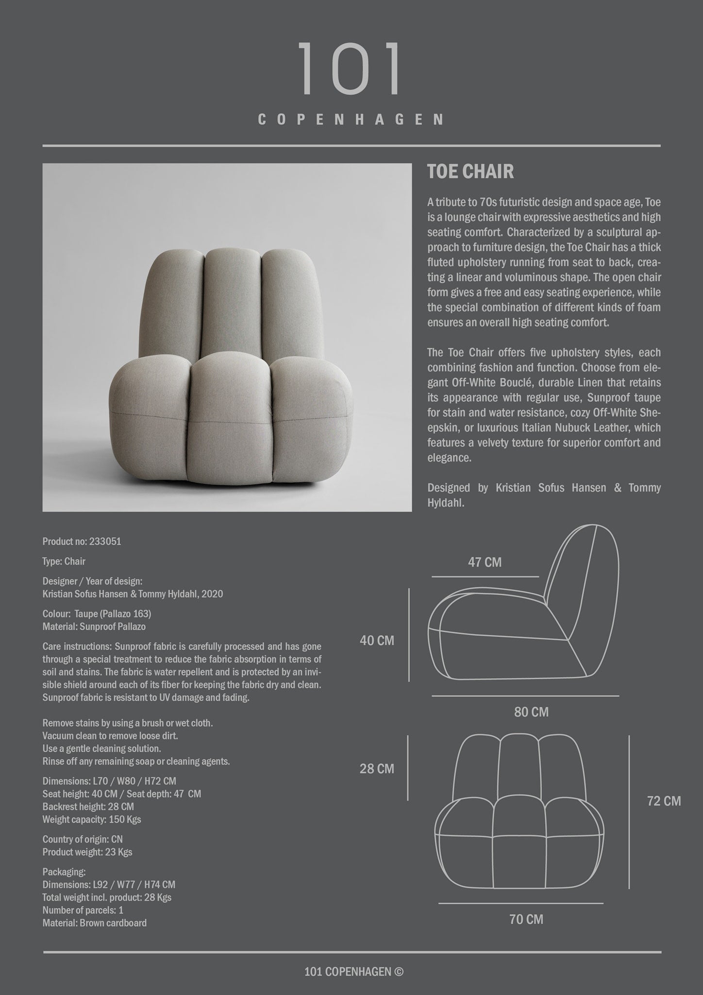 A tribute to 70s futuristic design and space age, Toe is a lounge chair with expressive aesthetics and high seating comfort. Characterized by a sculptural approach to furniture design, the Toe Chair has a thick fluted upholstery running from seat to back, creating a linear and voluminous shape. The open chair form gives a free and easy seating experience, while the special combination of different kinds of foam ensures an overall high seating comfort.