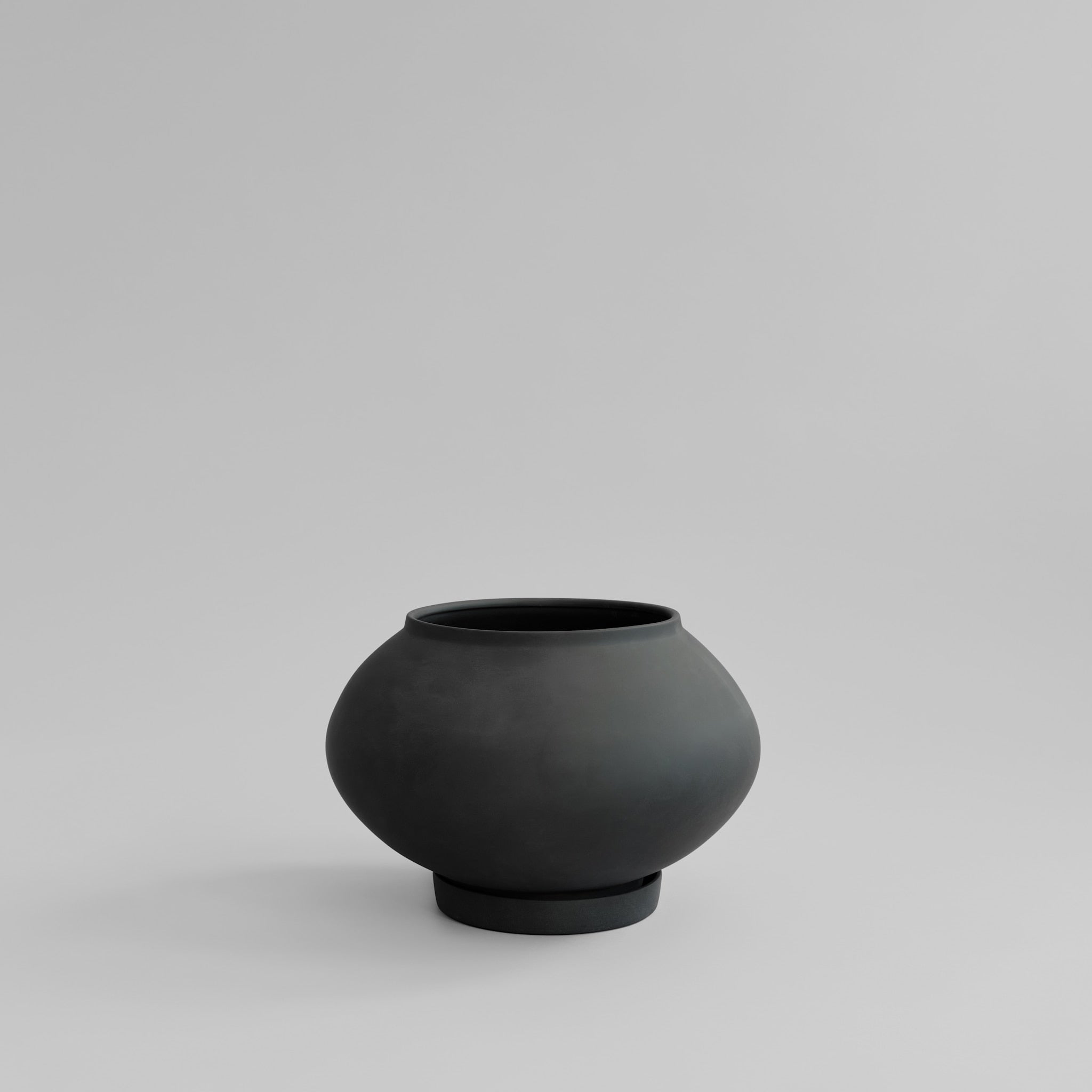 Finished in Black, a deep and pure tone, the hand-painted surface carries subtle variations in texture and depth, ensuring each piece is unique. Placed in a garden, on a patio, or within a modern interior, the Sunao Plant Pot Fat, Medio offers a sculptural, commanding presence that combines practical function with quiet elegance.